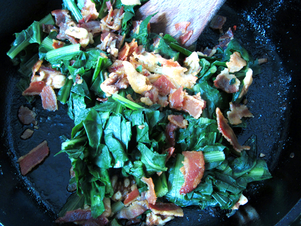* Add the garlic and dandelion to the nuts. Crumble in the pancetta. Stir to combine the flavors and heat through. Taste for seasoning but note some pancetta can pretty salty.