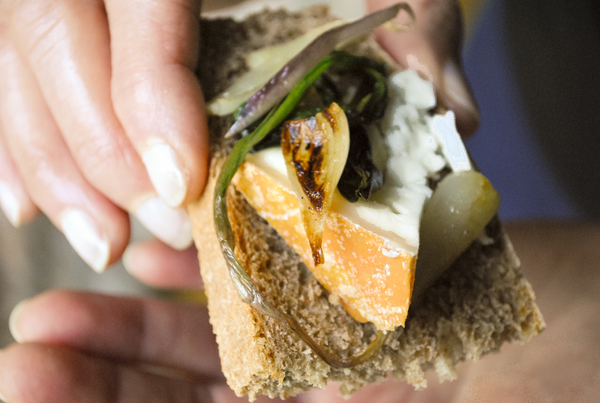 *Place the bread on a platter or board, drizzle with olive oil, and spread on the goat cheese. (Trust us, the olive oil makes a big difference– the cheese alone will be a bit dry with the bread. It also adds a great roundness of flavor.)