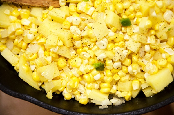 * Add the corn, potato, tumeric, and black pepper to taste. Cook a few minutes so the flavors are blended.