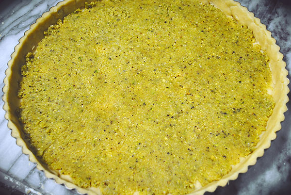*Using a rubber or metal spatula, spread pistachio-almond paste evenly over the bottom of the dough. It will be a thin layer. Work it all the way to the edges.
