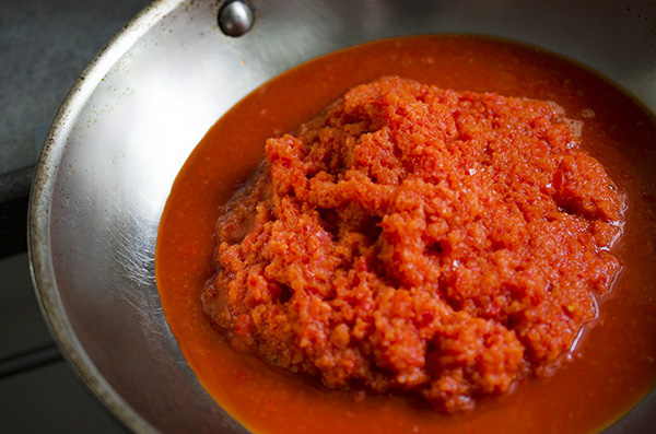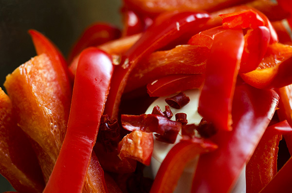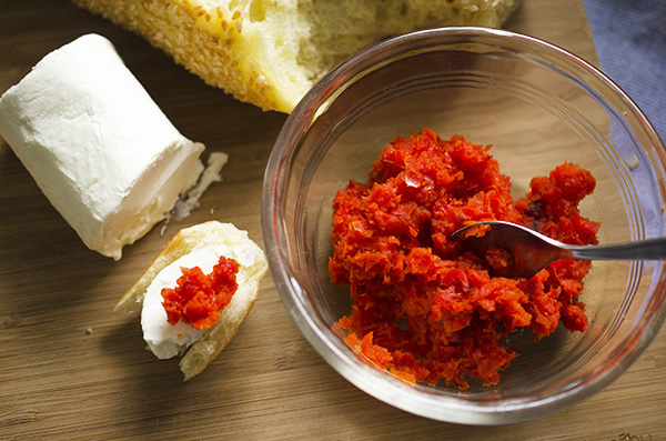 Allow about one pepper per person and add as much or as little cayenne pepper as you like, depending on how much spice you want. You can easily increase the quantities to make enough for a crowd. We used three large red peppers (1 1/3 lbs) and two dried cayenne peppers for a small group. A word to the wise: When you seed the hot peppers, do yourself a big favor and wear gloves or you’ll be one unhappy camper when you rub your eyes (or literally do just about anything) later. We think using two cayenne peppers makes a medium-hot spread. If that sounds a bit too spicy for you, remember that pairing the spread with other things, like cheese and bread, will mellow out the heat. But, if you don’t like any spice at all, you can certainly leave the hot peppers out altogether and just season with salt and some black pepper instead. Feel just the opposite? Turn up the heat as much as you like and keep the bread handy!