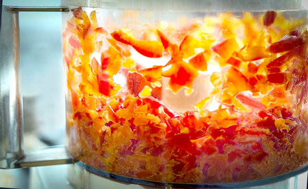 * With the metal blade in place, add the red and cayenne peppers to the bowl of your food