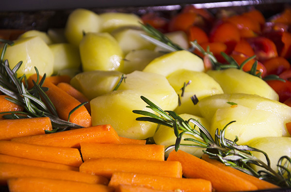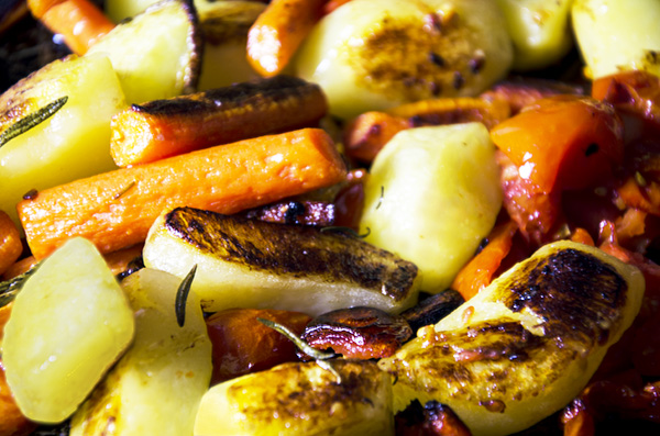 * Put the vegetables together on a baking sheet (feel free to line with foil for easy clean-up) and drizzle with olive oil, salt, and pepper. Toss to coat. Nestle the two rosemary sprigs between the vegetables.
