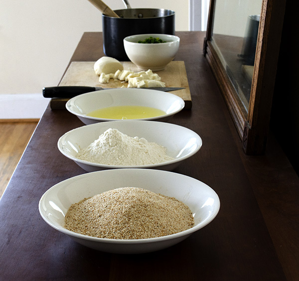 There’s something incredibly satisfying about taking something as simple as rice and turning it into something spectacular. Don’t be intimidated by the rolling and the stuffing. Arancini really are easy to prepare. (By now you should know that for us, very special recipes excepted, this is pretty much a necessity). Enlist someone you love—or at least love spending time with—to help. It’s so much fun to make these with another person or two. We often make them in tandem—one of us flouring and bread crumb coating, the other on egg white dipping duty. But if you’re flying solo, a tip: you might want to consider keeping one hand for dry ingredients and the other for wet so you don’t make a gloppy mess of your fingers.
