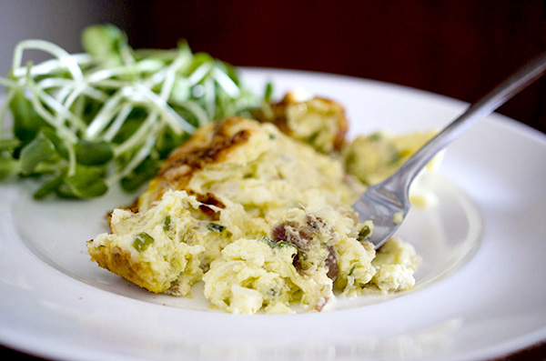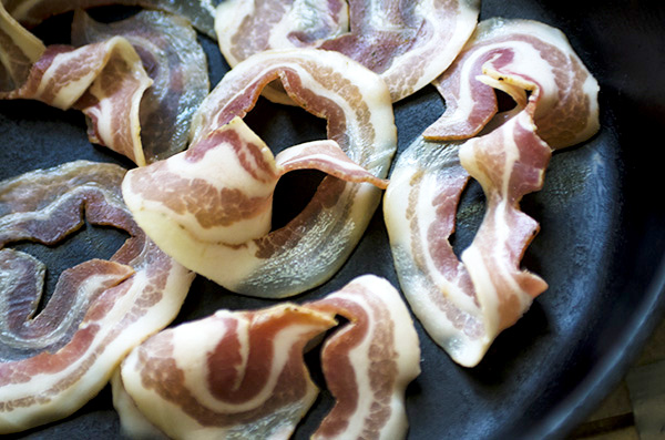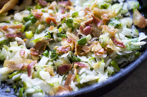 * Remove all but about a tablespoon of drippings from the frying pan, add the spring onions. Sauté until they’re translucent and just starting to show a little color. Don’t let them brown. Add to the bowl with the pancetta, mix, and set aside.