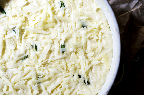 * Pour the finished mixture into your prepared soufflé dish. Level the soufflé off gently and if you like, run your finger or a knife around the edge to make a circle about an inch from the edge. This will create a “cap.” This is just decorative, not necessary. Sprinkle on the remaining cheese.
