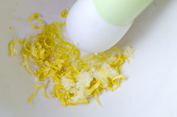 * In a small bowl, add the garlic, lemon salt, pepper, lemon juice, lemon zest, and olive oil. Mix well until blended.