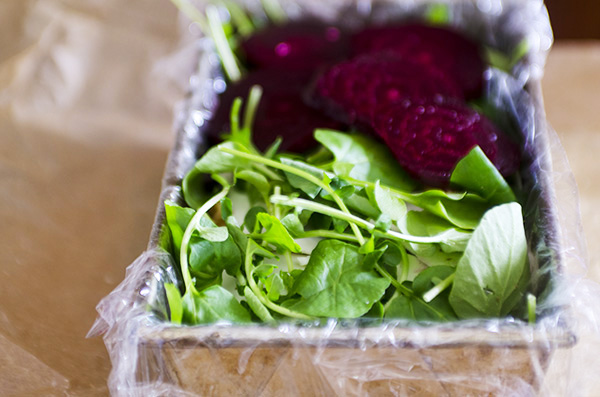 * Make a layer of beets at the bottom of the loaf pan on top of the plastic wrap, followed by a layer each of cheese, walnuts, and watercress. If you need to, cut the beet and cheese slices to fit. Repeat until you run out of ingredients and be sure to end with a layer of beets on top.