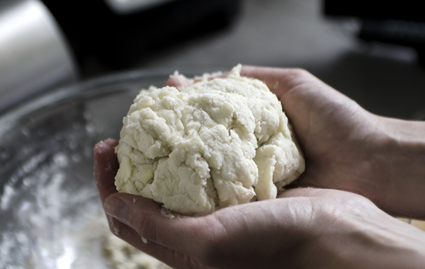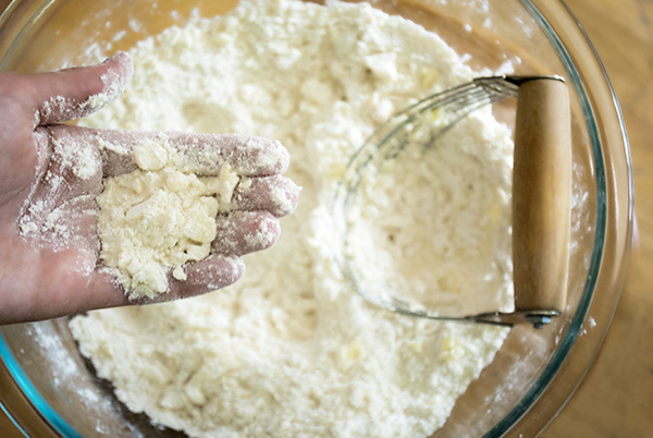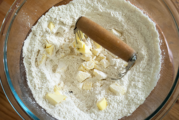 * Cut in cold butter with a pastry blender (or a fork) until you have a coarse meal with mostly pea-sized pieces of butter.