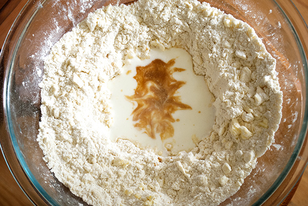 * Create a well in the center of the mixture and pour in the buttermilk and vanilla extract.