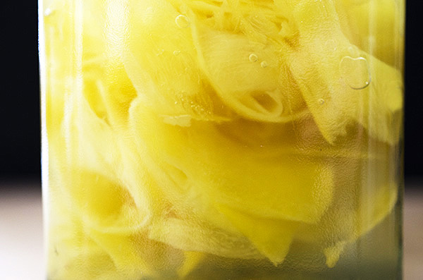 Important: These are refrigerator recipes, not canning recipes. However, a clean jar is always necessary for storing food, so we always sterilize our Mason, Ball or Fido jars before filling them with pickled ginger or jam. To sterilize your jars, wash them, along with their lids, in hot soapy water and rinse well. Place the jars in a large pot, open side up, and add water to cover. If the lids can be boiled, add them to the pot, too. Bring the whole thing to a boil and continue to boil for 10 minutes. Remove from heat and using tongs, place the jars and lids upside down on a clean kitchen towel to dry.