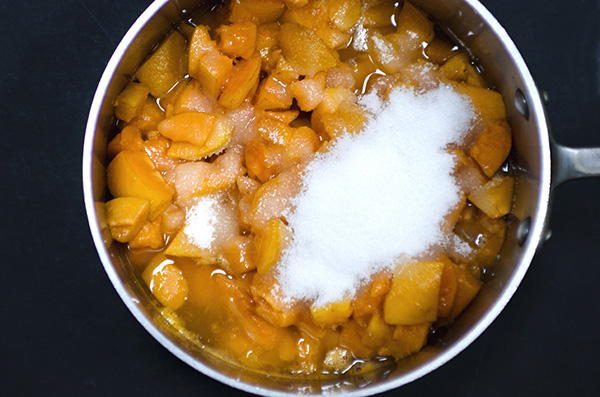 * Add apricots and water to a sauce pan. The fruit can boil up, so make sure your pan is large enough.