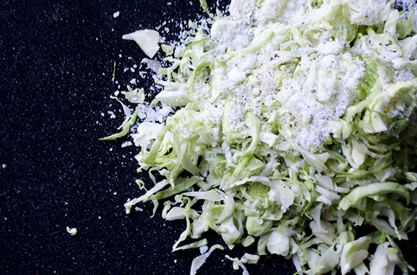 * Slice the sprouts very thinly and place in a bowl. You can use a food processor to slice them up instead, but we find it weirdly meditative to do it by hand (depending on our mood and how much time we have).
