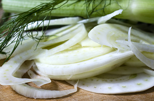 * Wash the fennel and remove the outer stalks if they are discolored. Thinly slice the bulb and tender pale green stalks, reserving some of the fronds to garnish.