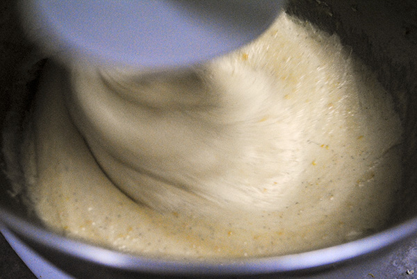 * With the mixer going at low speed, slowly add the water + yeast mixture and the egg + honey mixture to the bowl of flour, etc. Up the speed to medium and mix until everything is combined. (Don’t let it go too long.)