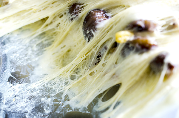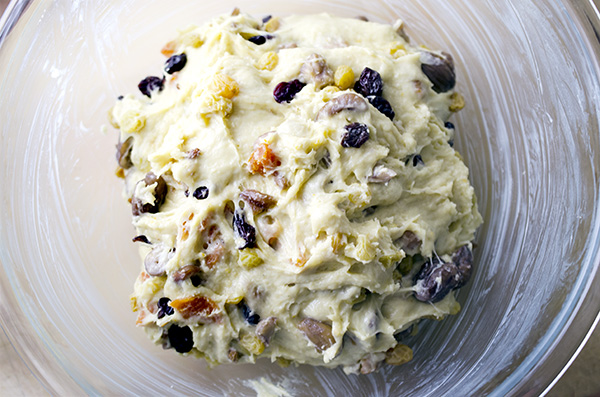 * Drain the raisins thoroughly. (We like to let them sit in a sieve or colander over a bowl while the dough is being kneaded.) Toss out the liquid and stop the mixer. Add the raisins, cherries, apricots, and chestnuts, plus the 1 tbs of melted butter to the dough. Stir everything in with a long wooden spoon or heavy-duty spatula. Gently mix until the fruit is pretty evenly distributed.
