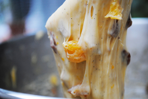 When I cook, I almost always feel like there’s some little change I’d make or a variation I’d like to try, but not here. This recipe is it. The incredible pull of yeast dough—totally unique in its airy chew—is one of the most amazing textures. You can’t get it without yeast. Making bread—and having it come out beautifully—always takes a little faith your ingredients, your abilities, and your recipe. Panettone is no exception, but the payoff is in some ways more unbelievable. The dough is like softly spun gold and just as precious after all the love and waiting that goes into it. Add tartly sweet fresh orange zest, dried apricots, cherries, golden raisins, vanilla seeds, and, the secret ingredient that puts it over the top, chestnuts, dotting the pale golden bread and you’ve got quite a thing to behold when all is done. There are different dried fruit combinations for Panettone, but to me, this one is absolutely perfect. I’ve looked all over, but I’ve never been able to find this exact flavoring in a store-bought Panettone. That alone is worth the baking.