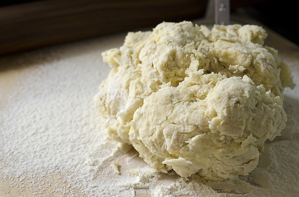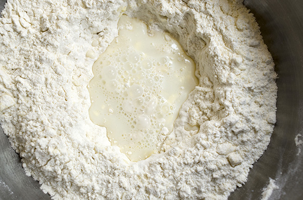 * Make a well in the center of your dry ingredients and add 1 cup of milk. With your hand, start incorporating the flour into the milk. Once everything is mixed, add the rest of your milk a little at a time as you mix until you end up with a soft dough that can be gently rolled out.