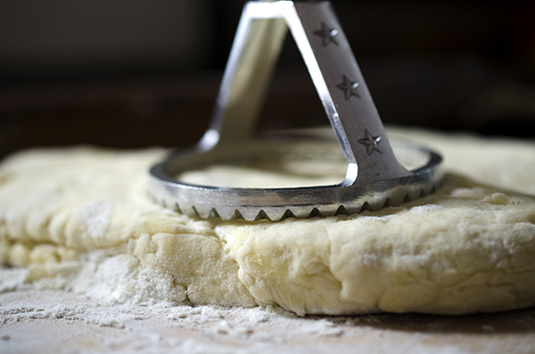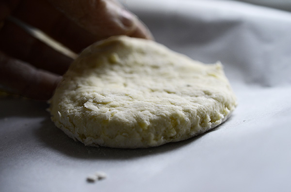 * Carefully roll out the dough to ¾ of an inch thick. Cut out scones using your cookie cutter and place them on your parchment-lined baking sheet. Make sure to leave some space between the scones for them to cook evenly and puff up as they bake.