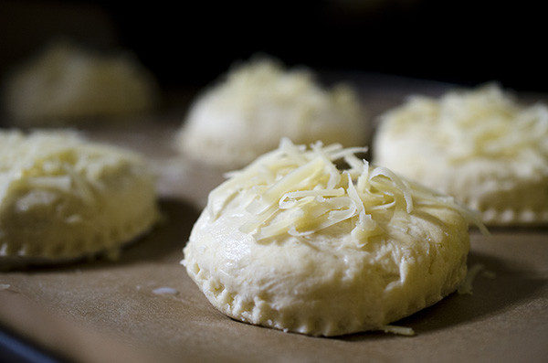 * Place the scones on the parchment, brush with a little milk, and sprinkle with the remaining cheddar.