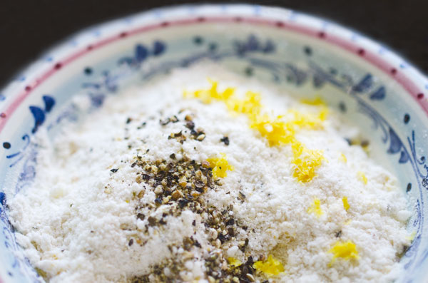 * In a small bowl, mix together the flour, Pecorino, salt, black pepper, and lemon zest.