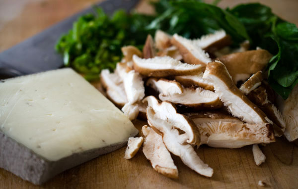 Our version here is packed with spring things and some of our favorite flavors: mushrooms, potatoes, herbs (chives and basil), ramps, and—wait for it—a gloriously melty cheese with tiny bits of truffles. Yessss.