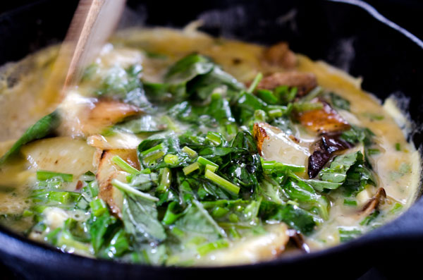 * Cook the eggs, gently nudging in the edges as they set with a wooden or silicon spatula so that the raw egg can leak over and cook. Don’t stir or scramble. Cover pan with a lid just for a minute or so to help everything set.