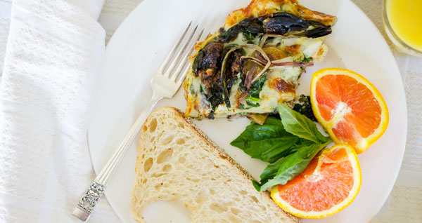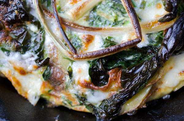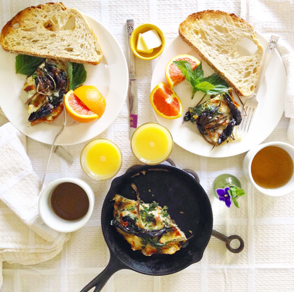 This week, we decided to toss them on top one of our favorite go-to, seat-of-your-pants, we-have-to-eat-in-the-next-20-minutes-or-else-we’ll-miss-the-movie meals: the frittata. Satisfying, delicious, and a fantastic way to clean out your fridge, frittatas are like pasta in that: a) you can throw just about anything you want in them and you’ll get a great meal, b) you most likely have all the ingredients you need to make a great one in your kitchen right now, and c) you get maximum taste points for minimal effort exerted. It’s also pretty hard to make a frittata that isn’t a looker. Put a frittata, some crusty bread, and maybe a salad or some fruit on your table and you’ve got one gorgeous meal.