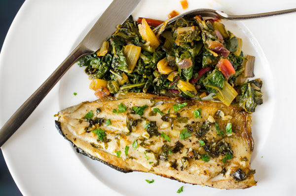 The perfect accompaniment to trout’s mellow flavor: rainbow chard. Its gorgeous color will pep things up, and its flavor and fiber will fill you up happily. The pair makes a one nice plate together. So simple, but so good. Side perk: just like trout, chard is really, really good for you, making this one kick-ass easy meal. Fast, delicious, healthy, inexpensive, and a looker to boot: That’ll definitely do the trick, won’t it?
